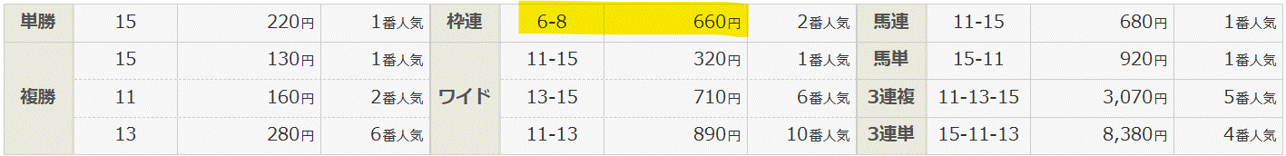 このレースで勝ったのは、単勝1番人気の8枠⑮ドラゴンウェルズ。 2着には2番人気の6枠⑪ドンレパルスが入って、枠連は660円つきました。